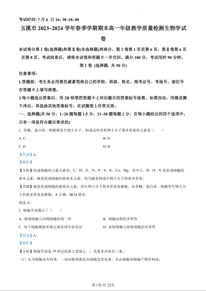 云南省玉溪市2023-2024学年高一下学期期末教学质量检测生物(精品解析版)