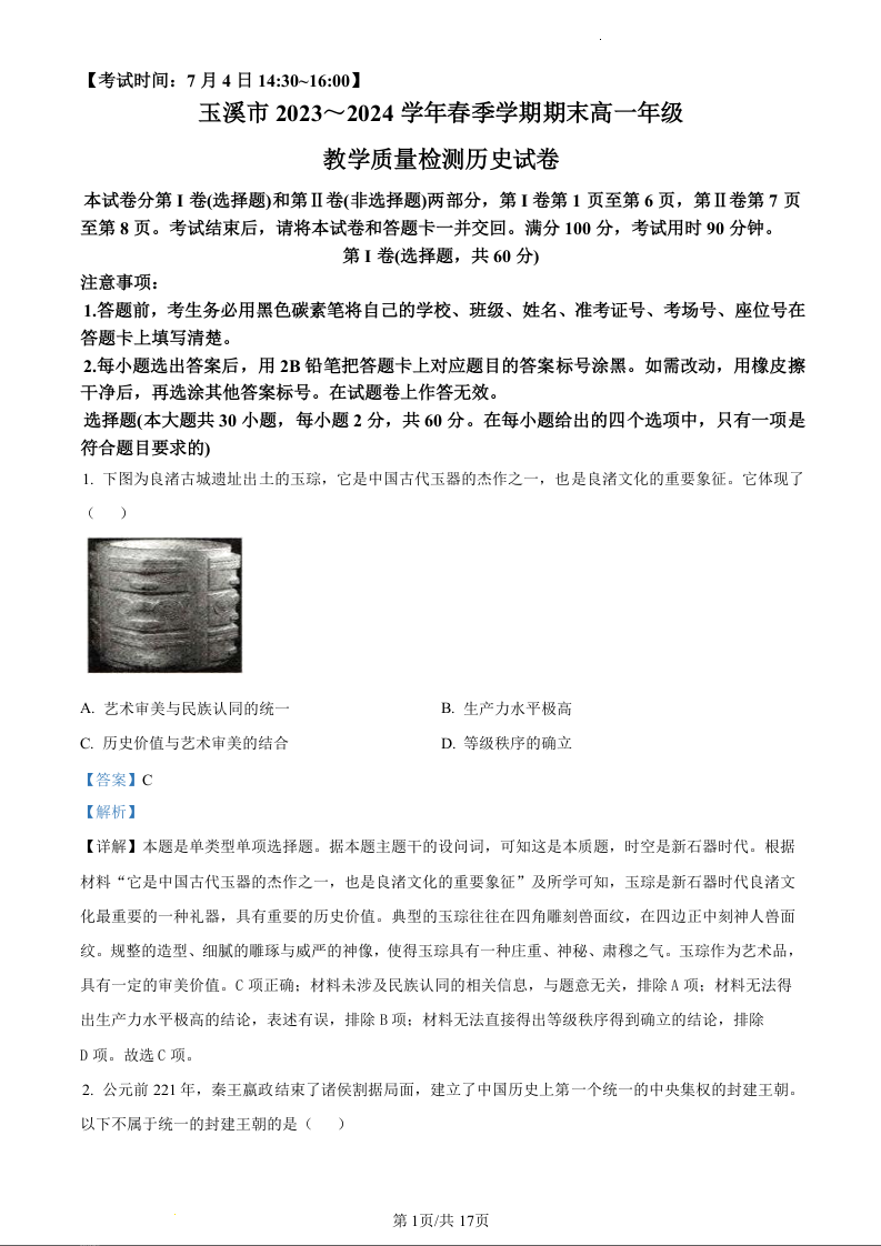 云南省玉溪市2023-2024学年高一下学期期末教学质量检测历史(精品解析版)