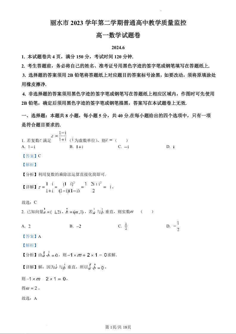 浙江省丽水市2023-2024学年高一下学期期末考试数学(精品解析版)