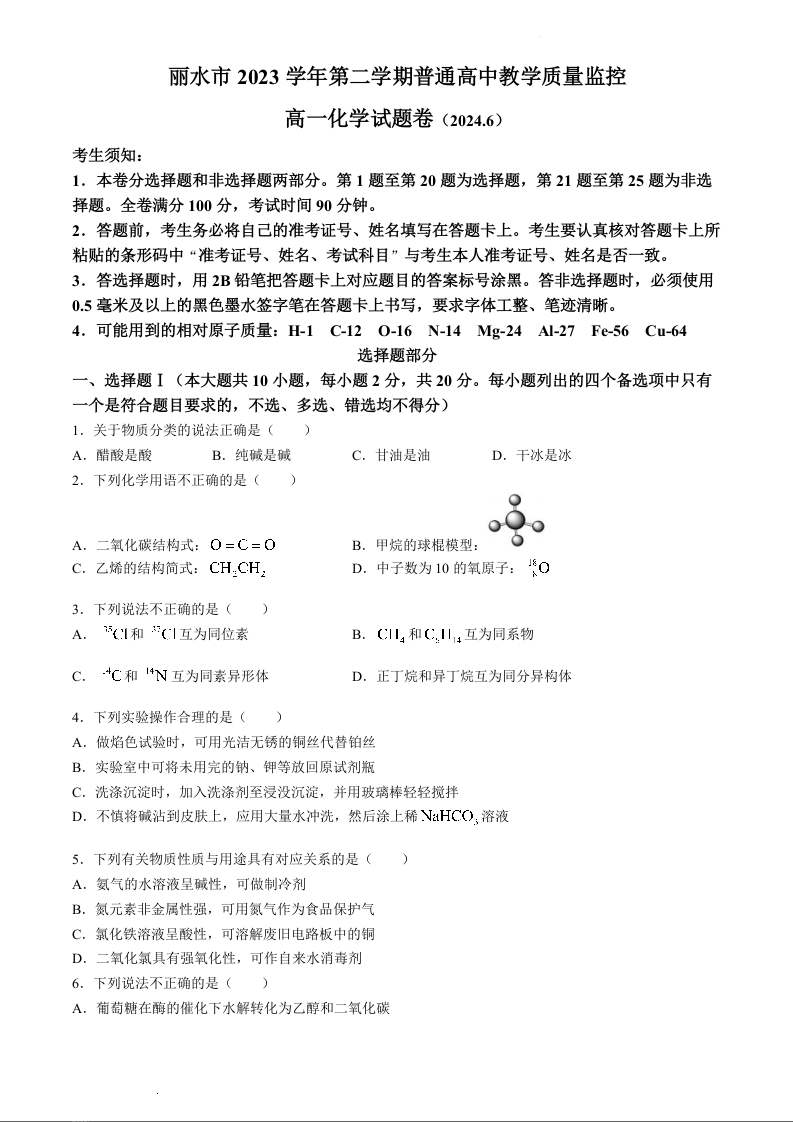 浙江省丽水市2023-2024学年高一下学期期末考试化学+答案