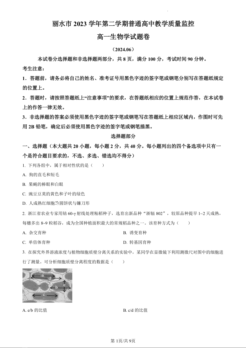 浙江省丽水市2023-2024学年高一下学期期末考试生物(原卷版)