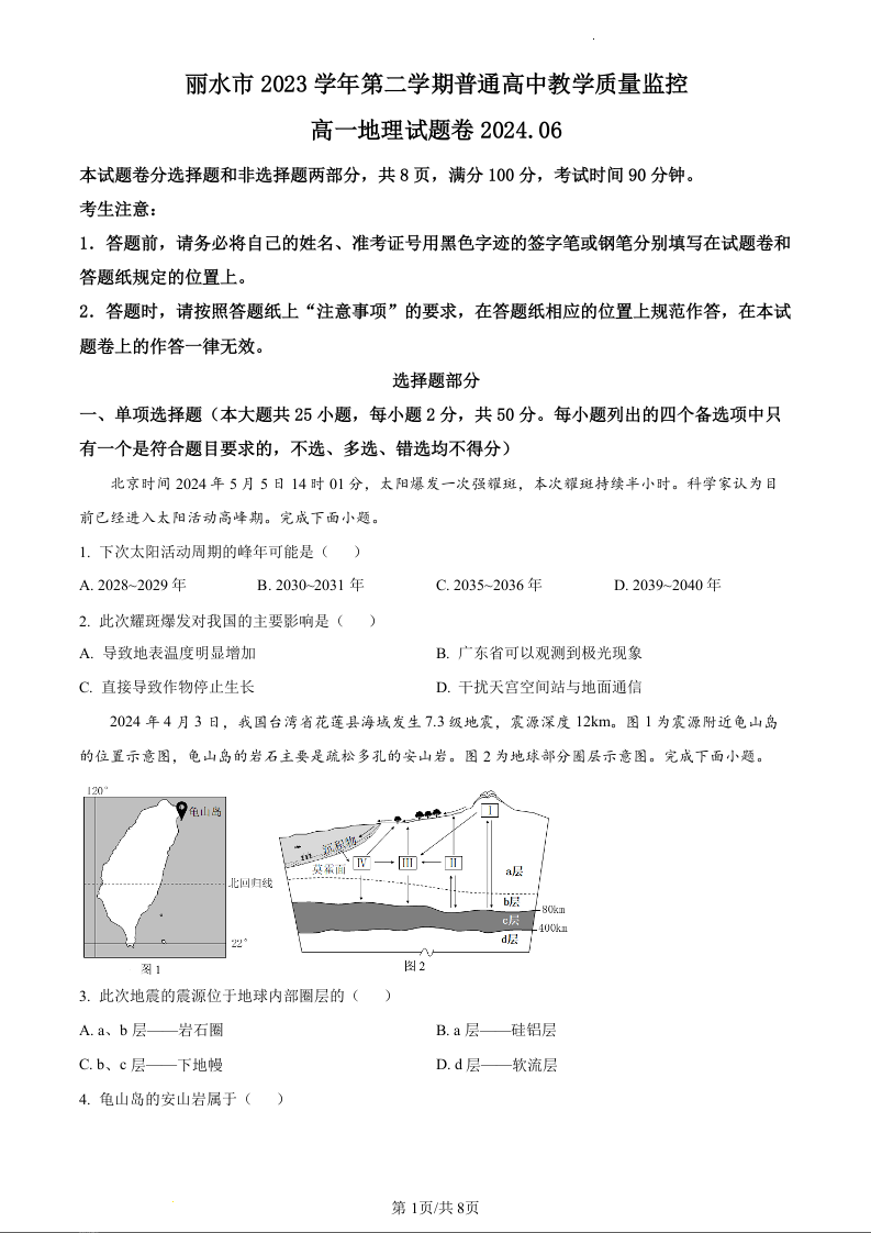 浙江省丽水市2023-2024学年高一下学期期末考试地理(原卷版)