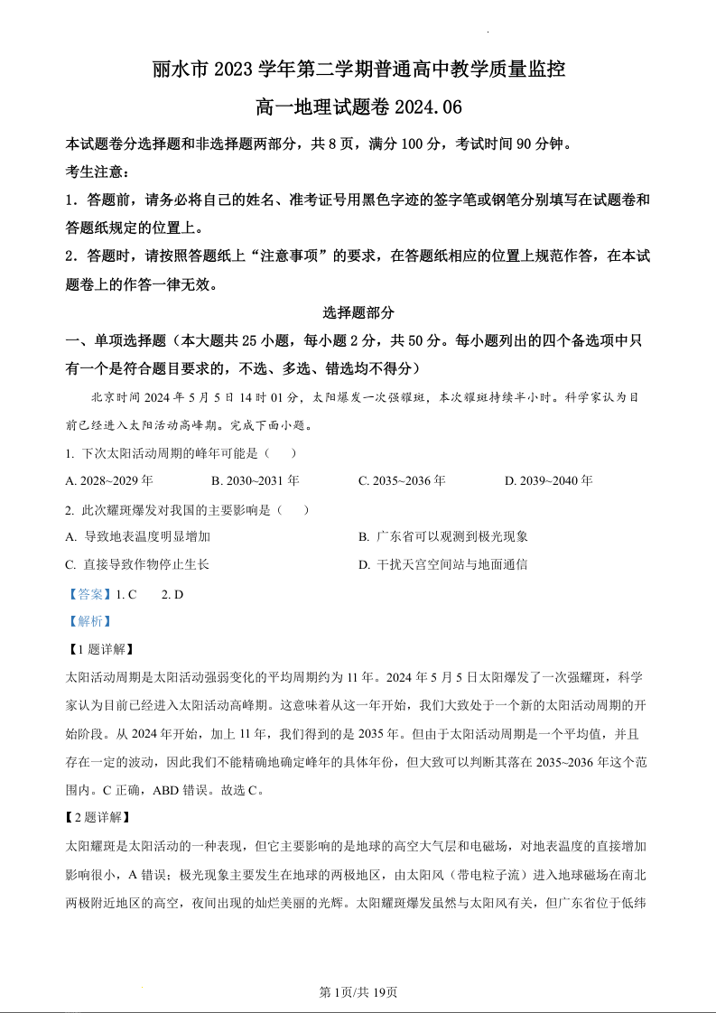 浙江省丽水市2023-2024学年高一下学期期末考试地理(精品解析版)
