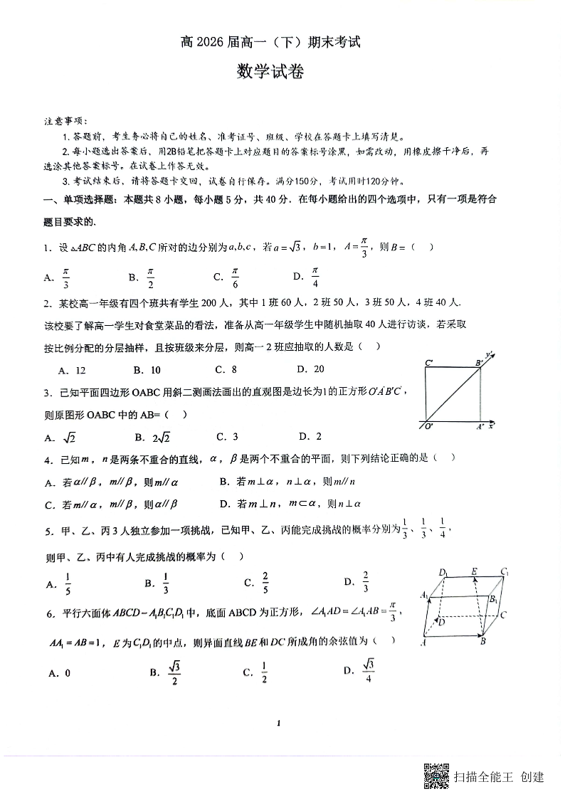 重庆市巴蜀中学校2023-2024学年高一下学期期末考试数学