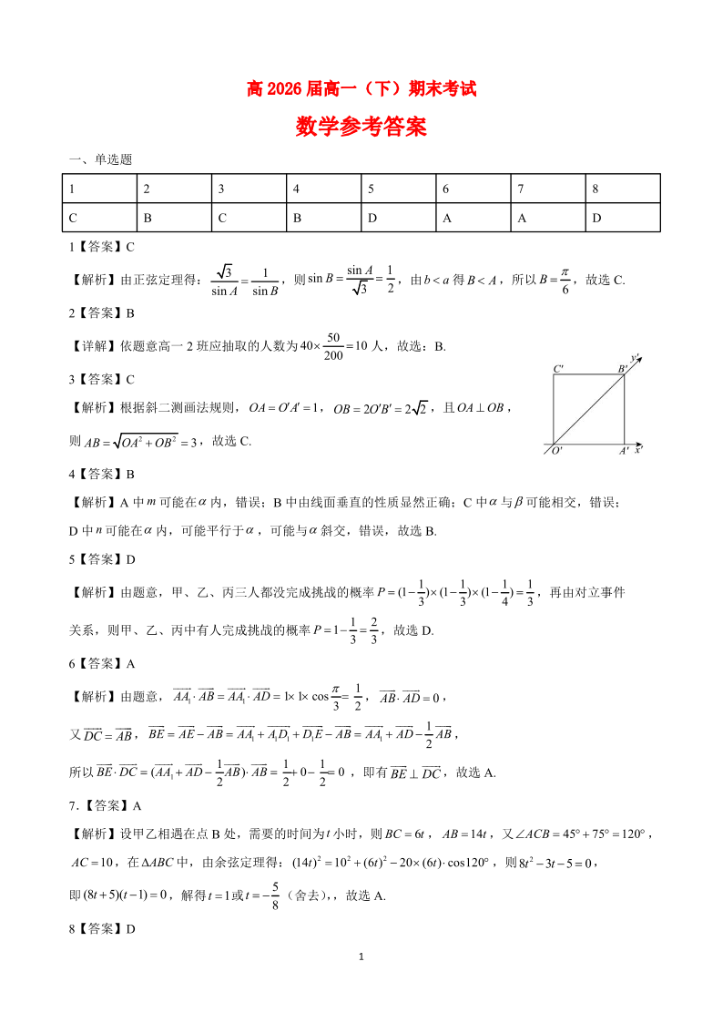 重庆市巴蜀中学校2023-2024学年高一下学期期末考试数学答案