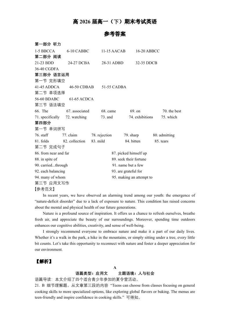 重庆市巴蜀中学校2023-2024学年高一下学期期末考试英语答案