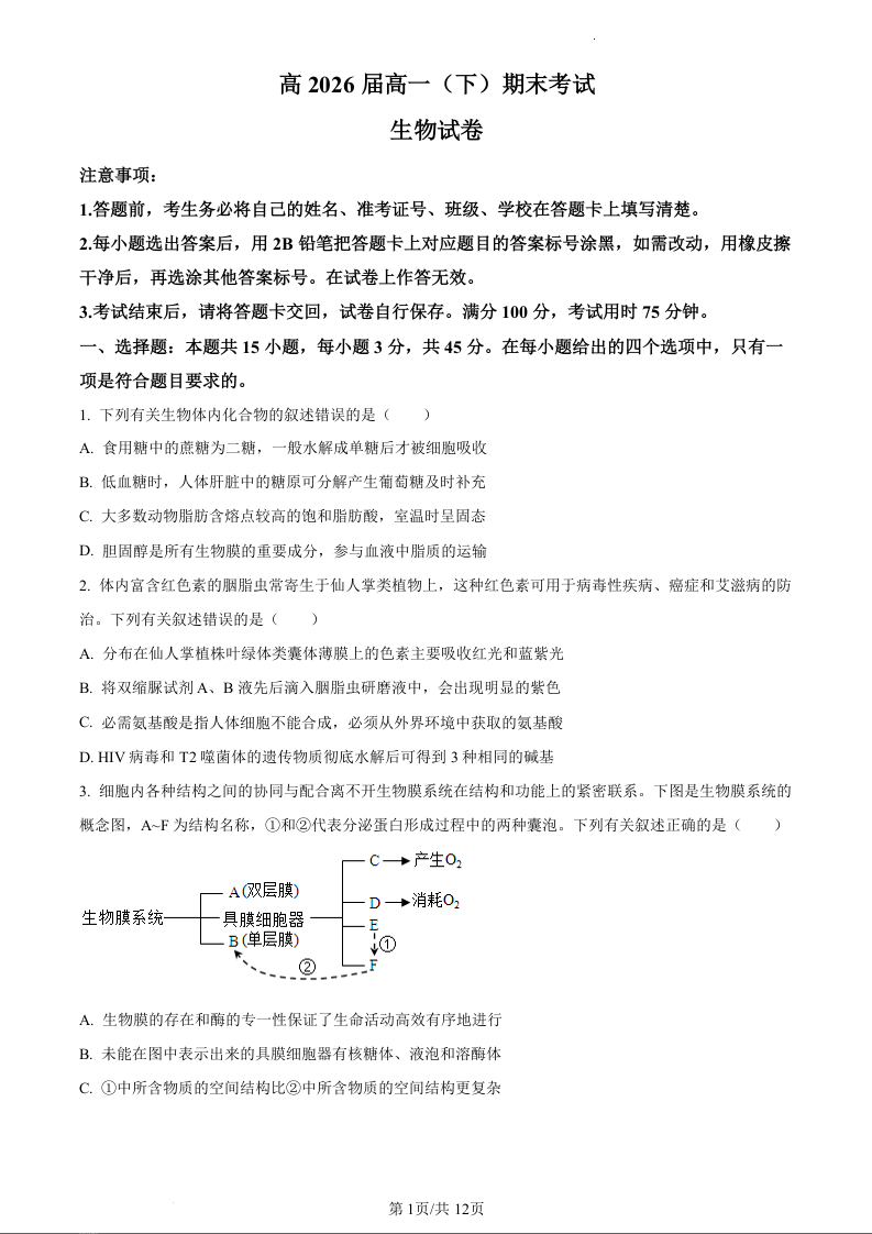 重庆市巴蜀中学校2023-2024学年高一下学期期末考试生物+答案