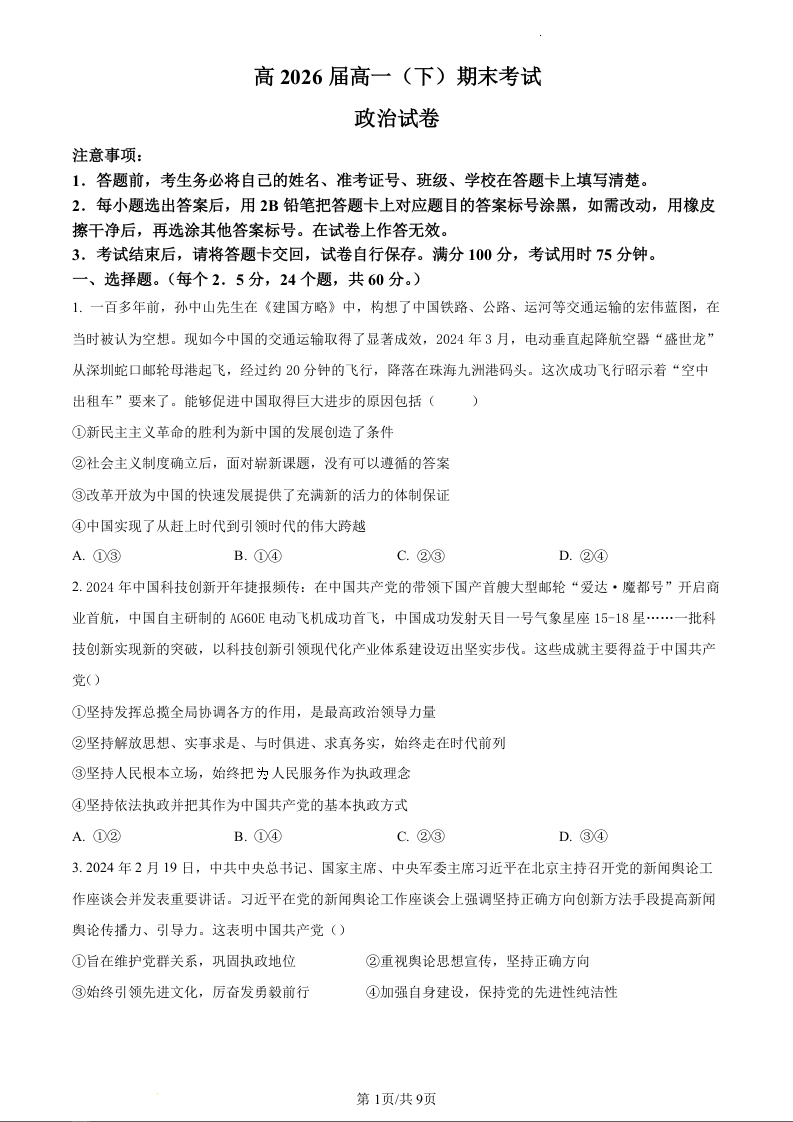 重庆市巴蜀中学校2023-2024学年高一下学期期末考试政治(原卷版)