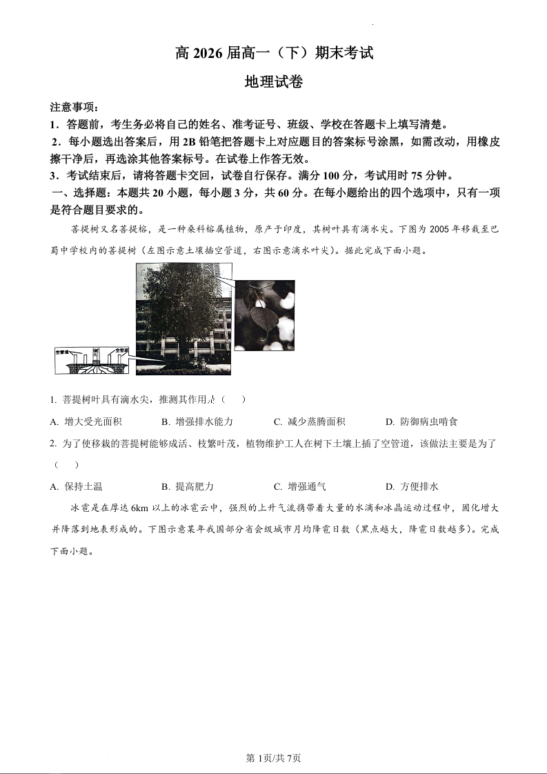 重庆市巴蜀中学校2023-2024学年高一下学期期末考试地理(原卷版)