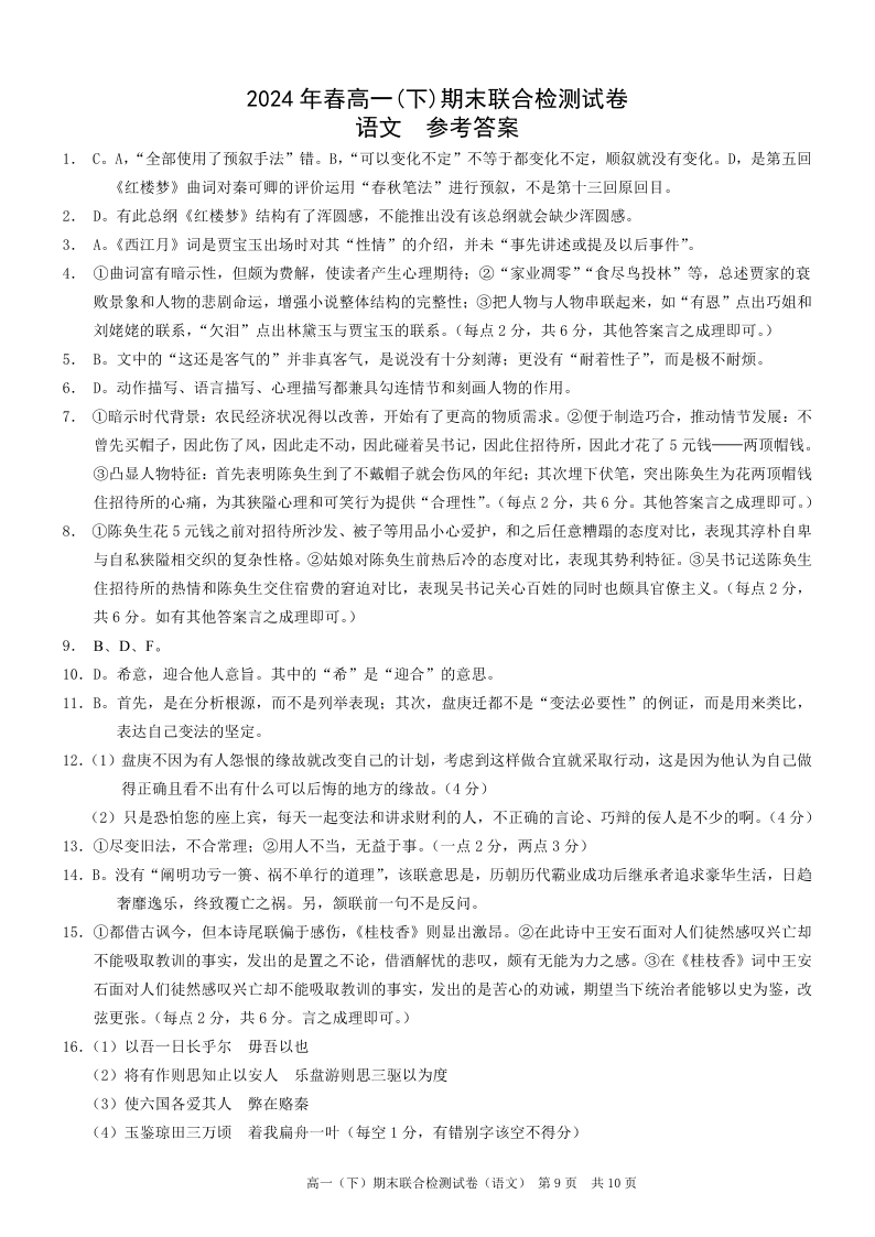 重庆康德卷2024年春高一(下)期末联合检测语文答案