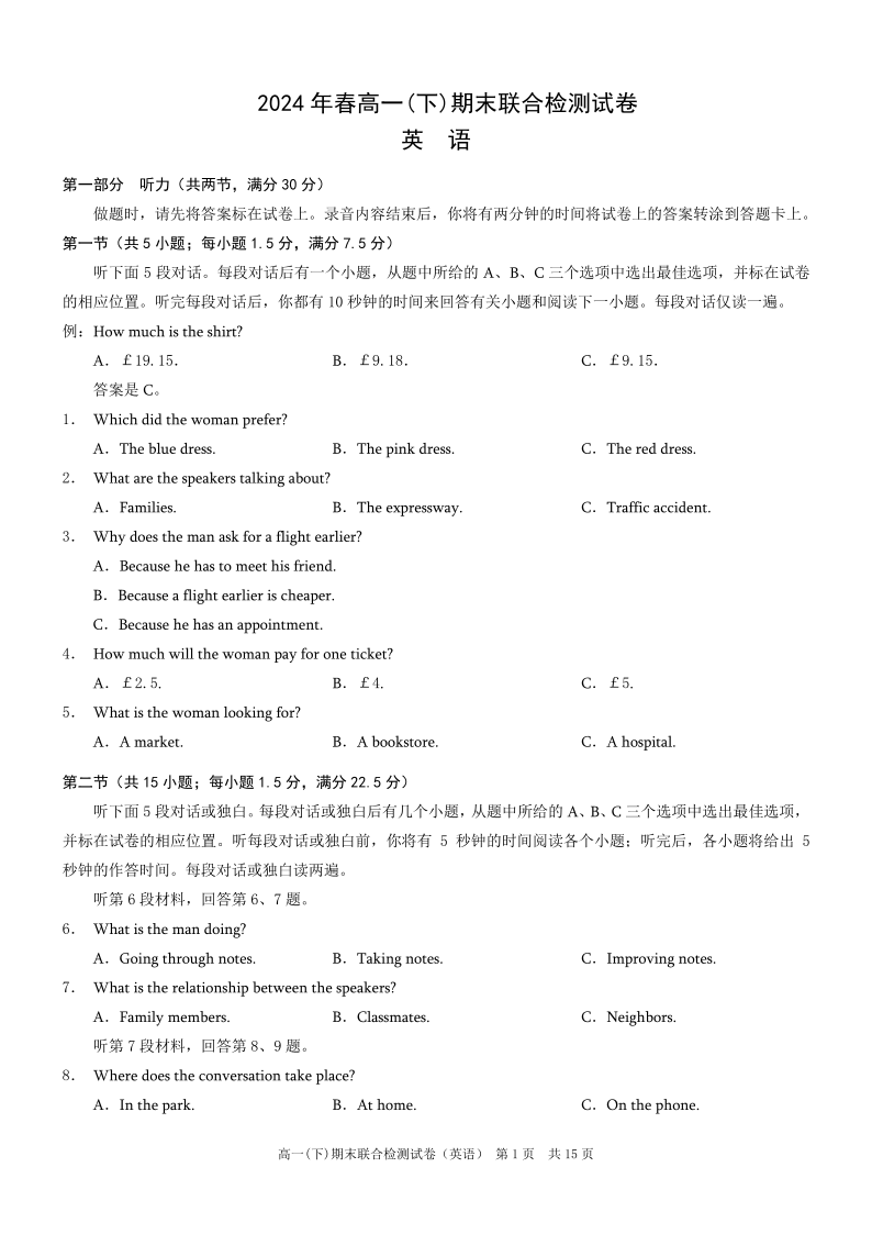 重庆康德卷2024年春高一(下)期末联合检测英语