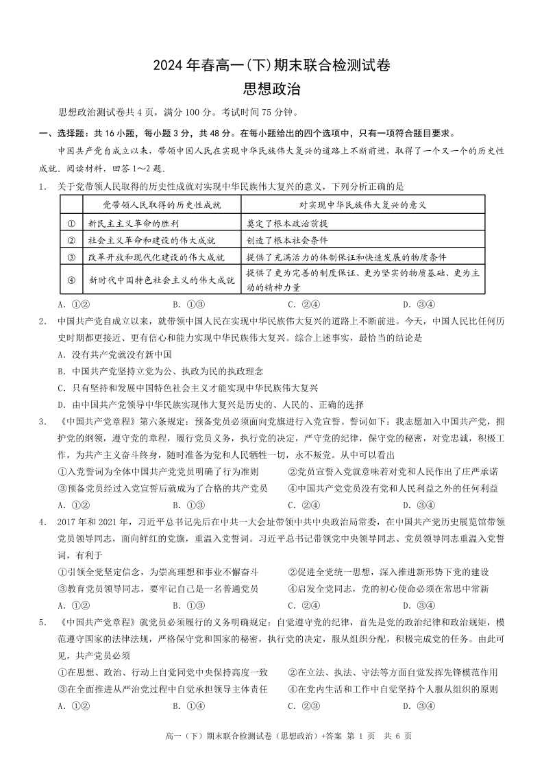 重庆康德卷2024年春高一(下)期末联合检测政治