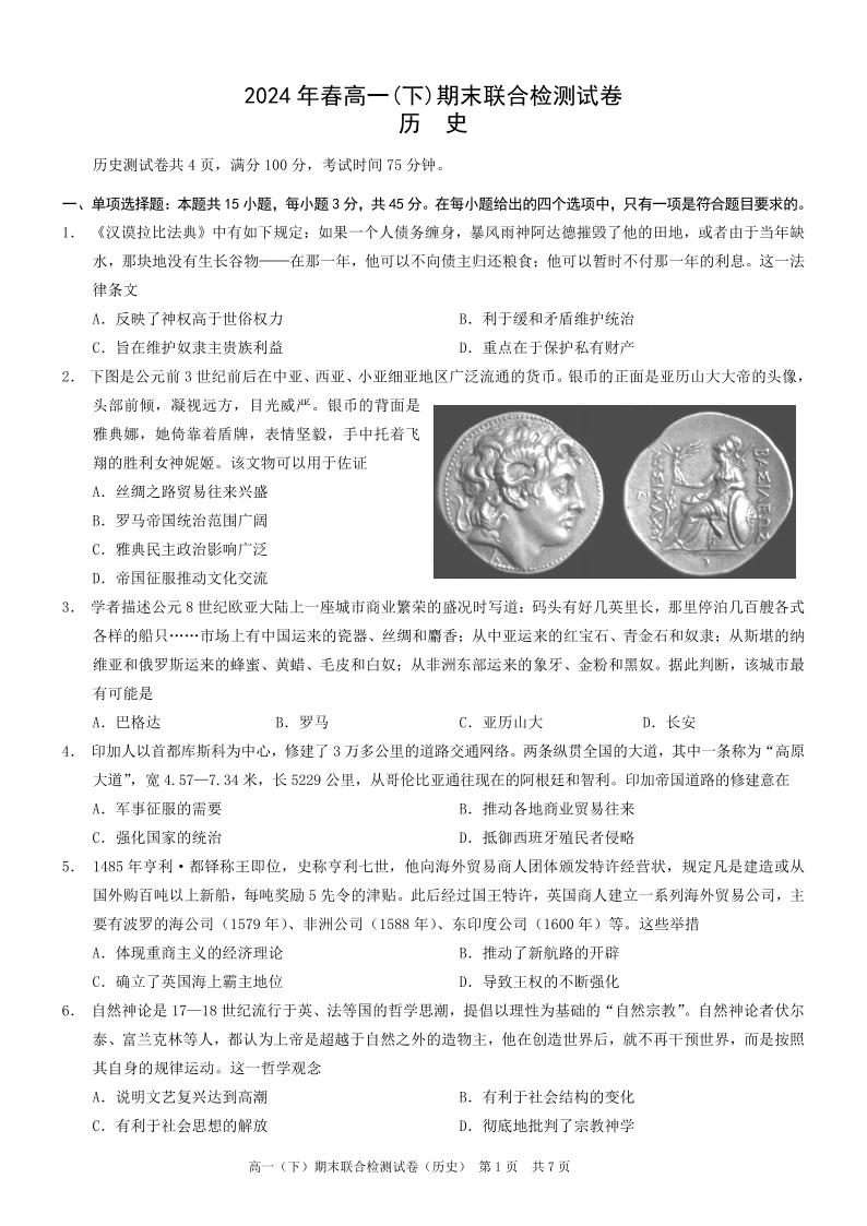 重庆康德卷2024年春高一(下)期末联合检测历史
