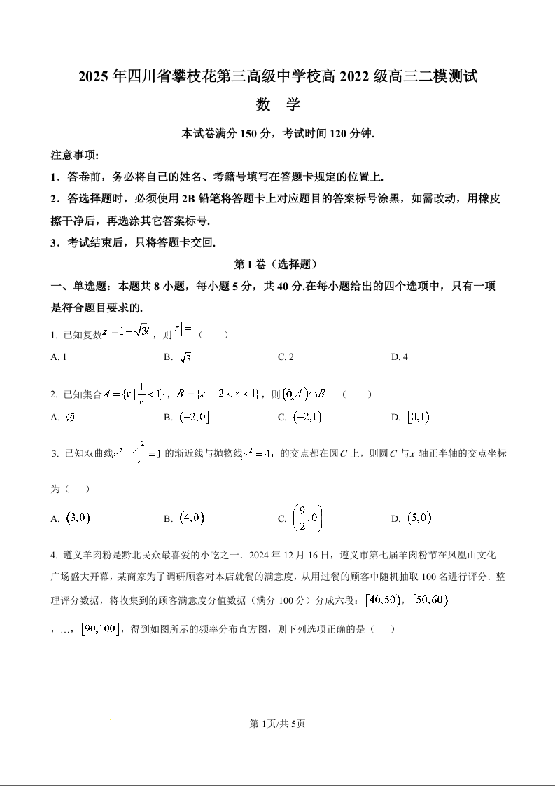四川省攀枝花市第三高级中学2024-2025学年下学期高三二模考试数学(原卷版)