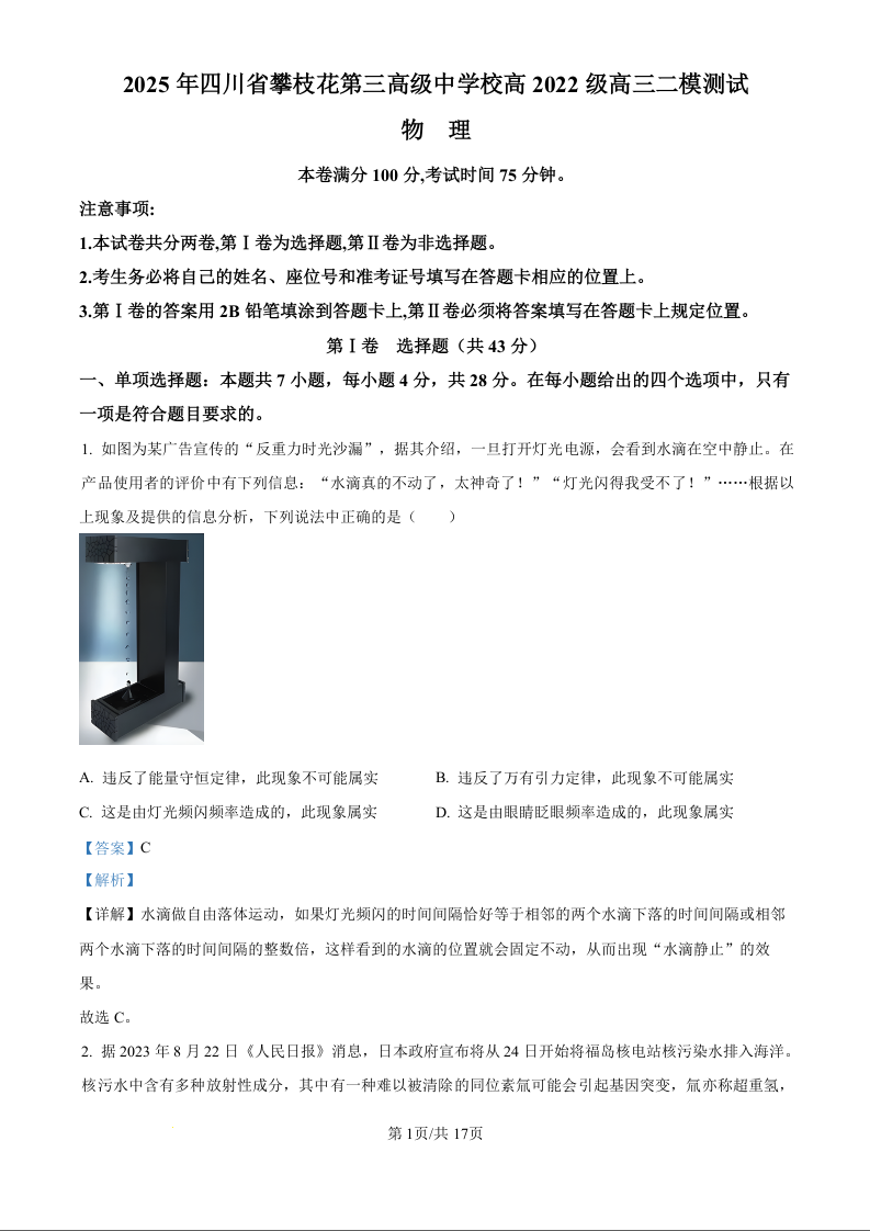 四川省攀枝花市第三高级中学2024-2025学年下学期高三二模考试物理(精品解析版)
