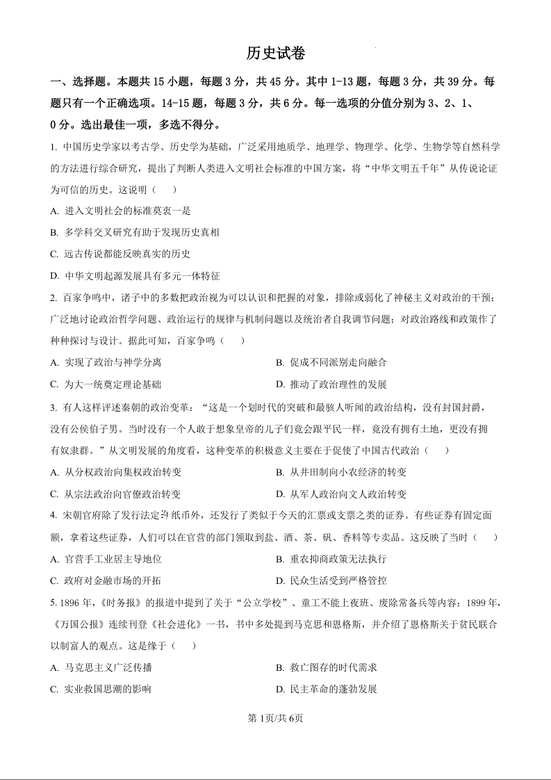 天津市武清区杨村第一中学2024-2025学年下学期高三一模历史(原卷版)