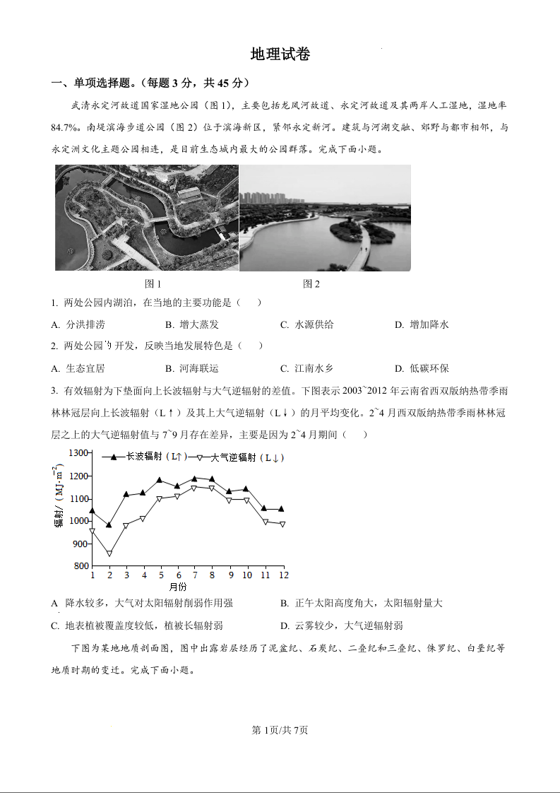 天津市武清区杨村第一中学2024-2025学年下学期高三一模地理(原卷版)