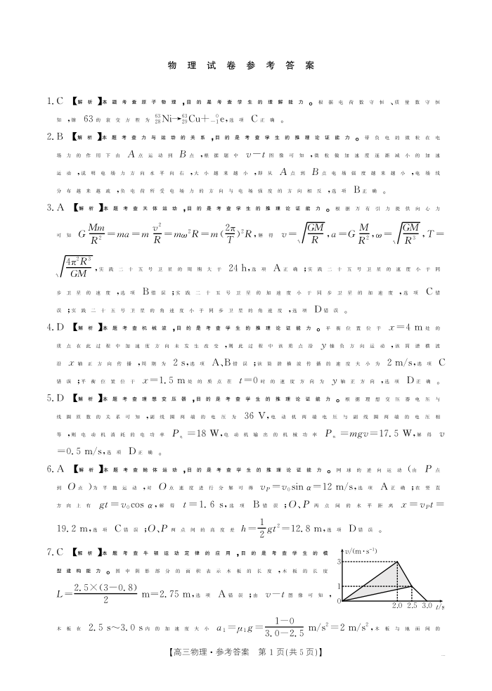 辽宁省抚顺市六校协作体2024-2025学年下学期高三期初检测物理答案