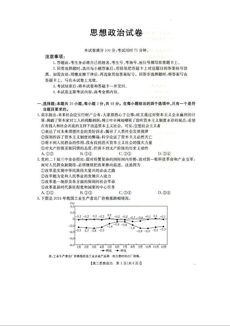 辽宁省抚顺市六校协作体2024-2025学年下学期高三期初检测政治