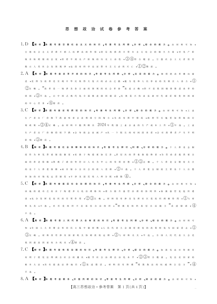 辽宁省抚顺市六校协作体2024-2025学年下学期高三期初检测政治答案