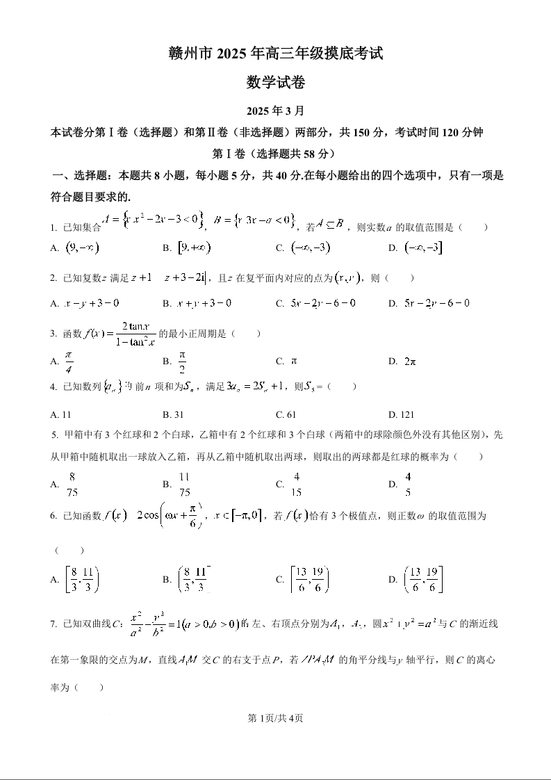 江西省赣州市2024-2025学年下学期3月高三一模考试数学(原卷版)
