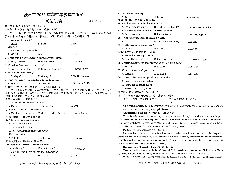 江西省赣州市2024-2025学年下学期3月高三一模考试英语