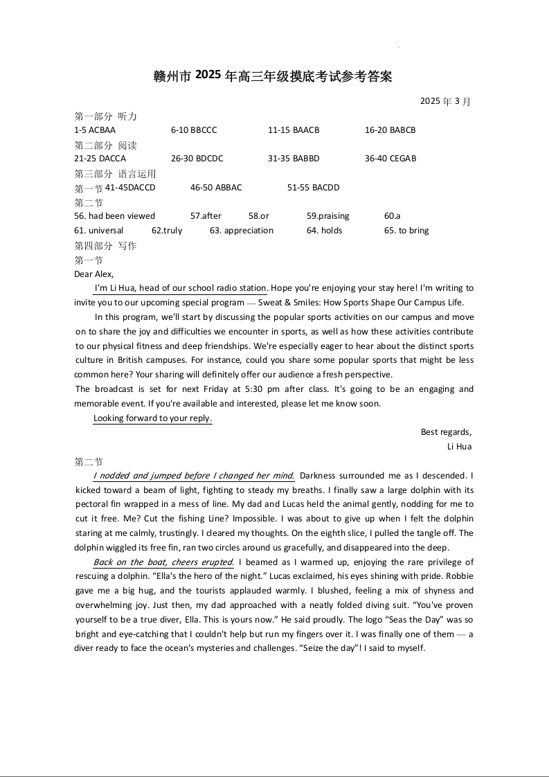 江西省赣州市2024-2025学年下学期3月高三一模考试英语答案
