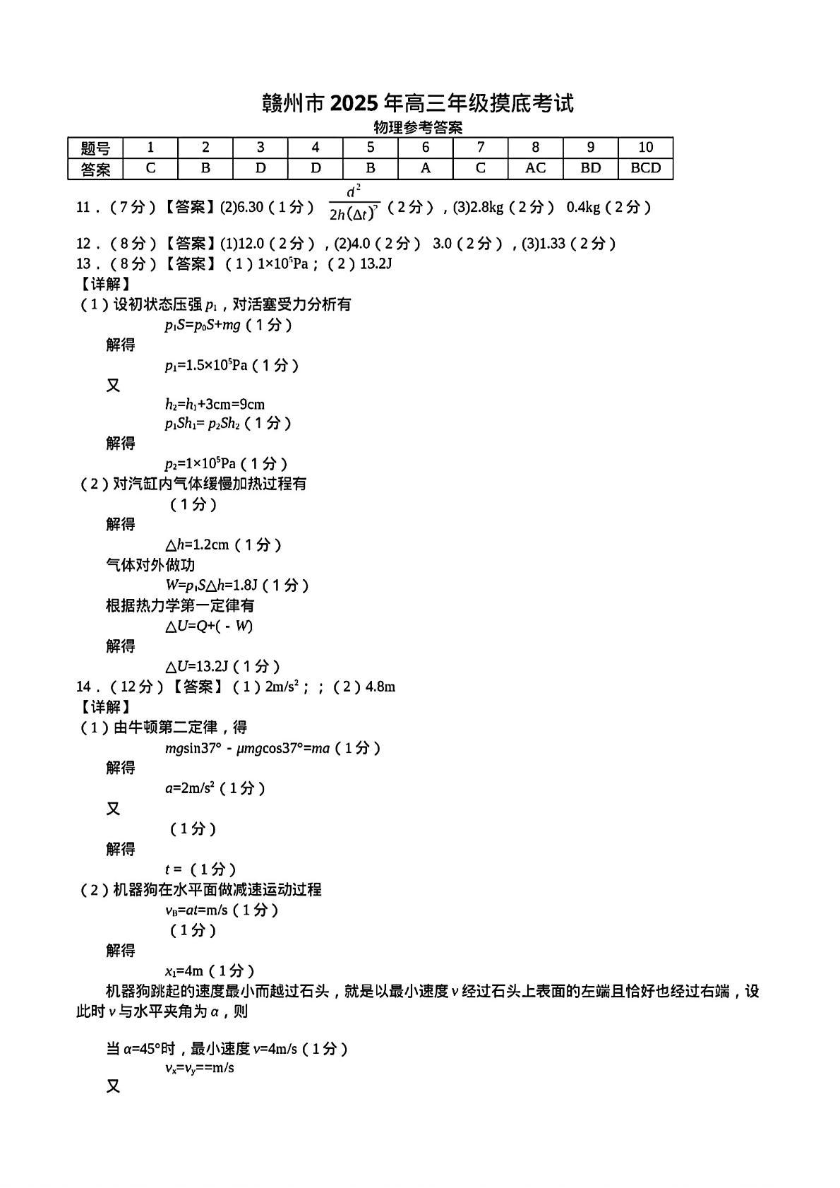 江西省赣州市2024-2025学年下学期3月高三一模考试物理答案