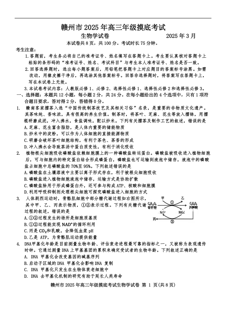 江西省赣州市2024-2025学年下学期3月高三一模考试生物