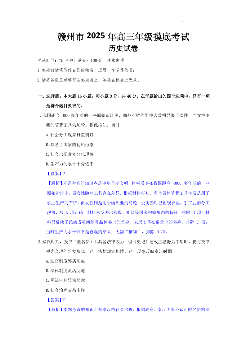 江西省赣州市2024-2025学年下学期3月高三一模考试历史(解析版)