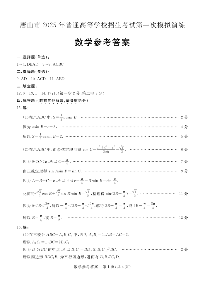 河北省唐山市 、廊坊市 2024-2025学年高三第一次高考模拟演练数学答案