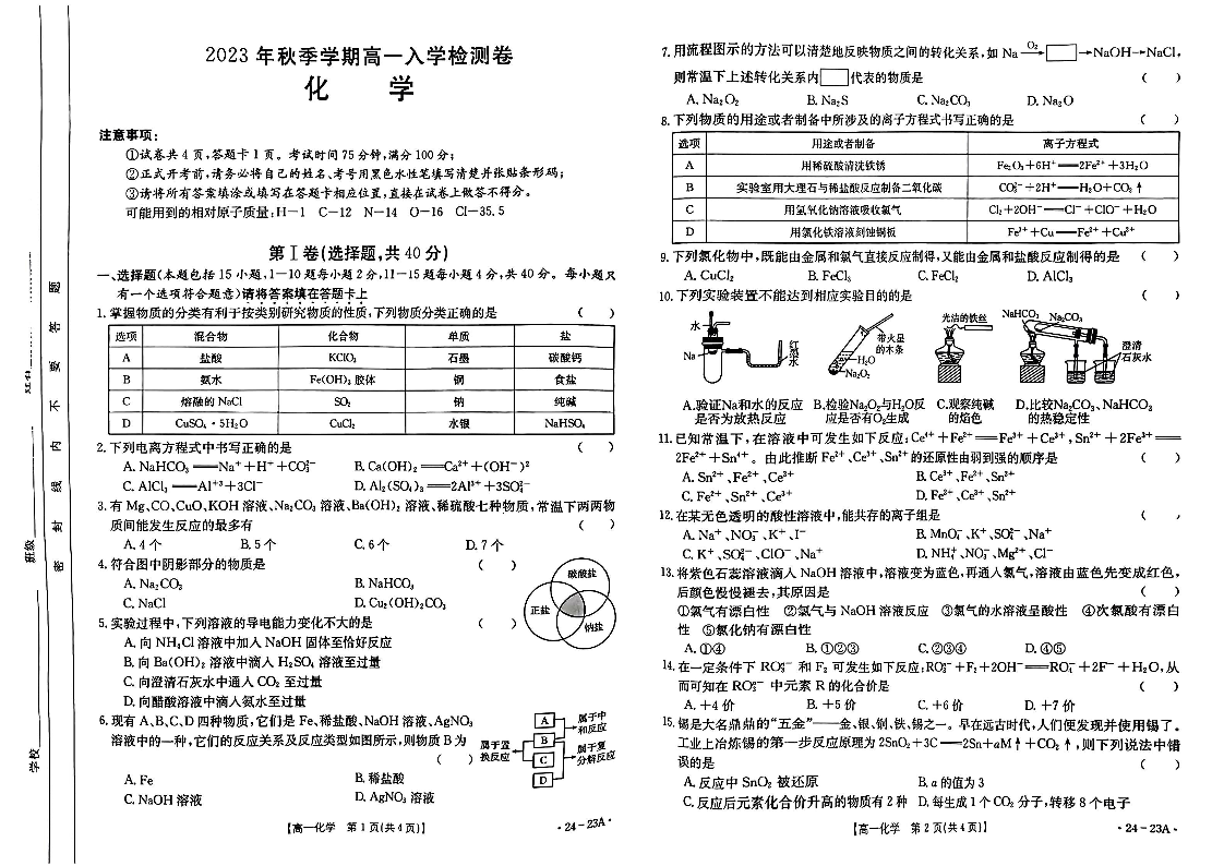 广西贵港市名校2023-2024学年高一上学期入学联考化学