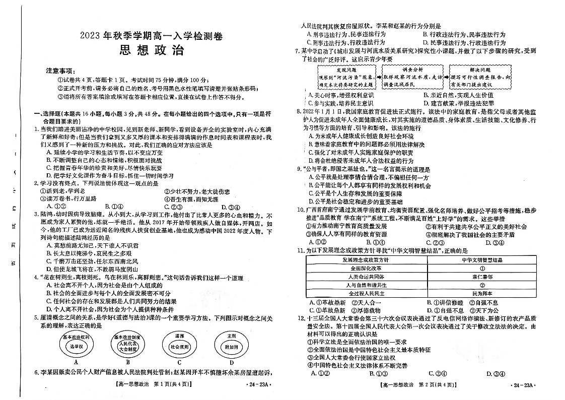 广西贵港市名校2023-2024学年高一上学期入学联考政治