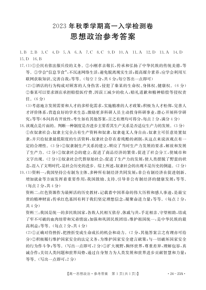 广西贵港市名校2023-2024学年高一上学期入学联考政治答案