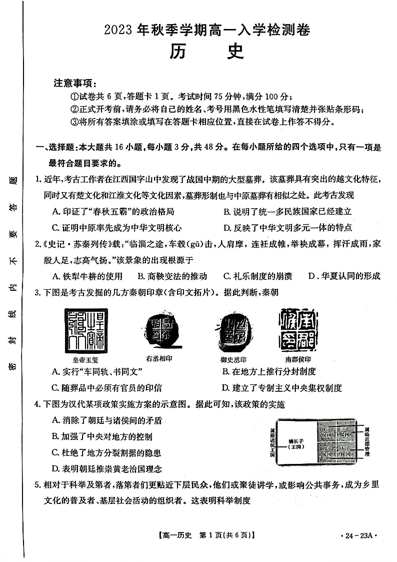广西贵港市名校2023-2024学年高一上学期入学联考历史