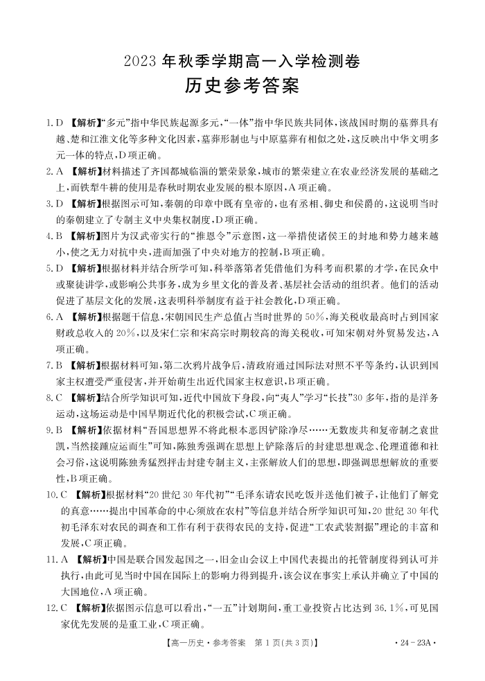 广西贵港市名校2023-2024学年高一上学期入学联考历史答案