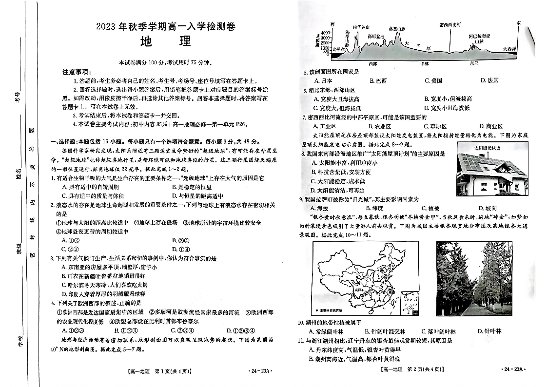 广西贵港市名校2023-2024学年高一上学期入学联考地理