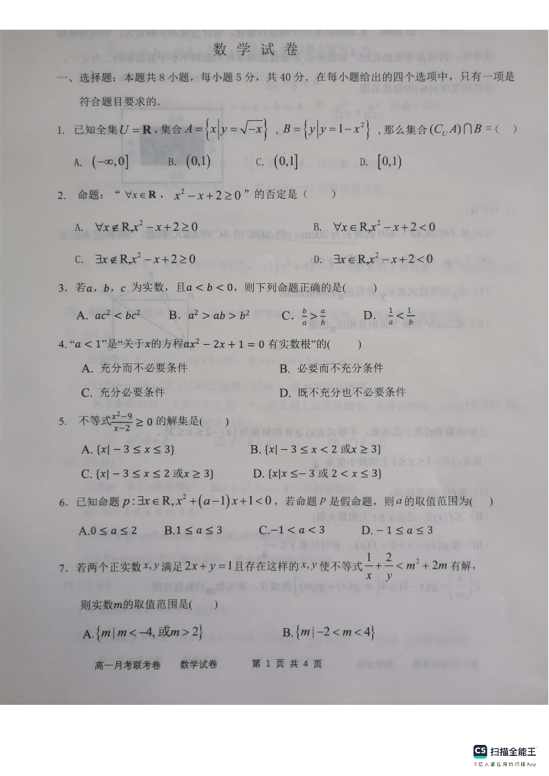 河南省河南中原名校联考2023-2024学年高一上学期9月月考数学