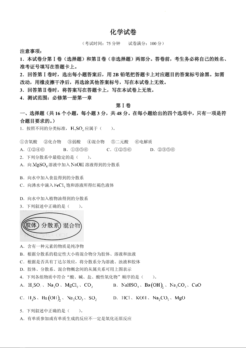 河南省河南中原名校联考2023-2024学年高一上学期9月月考化学+答案