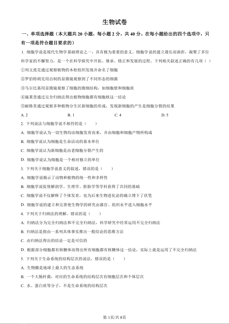 河南省河南中原名校联考2023-2024学年高一上学期9月月考生物(原卷版)