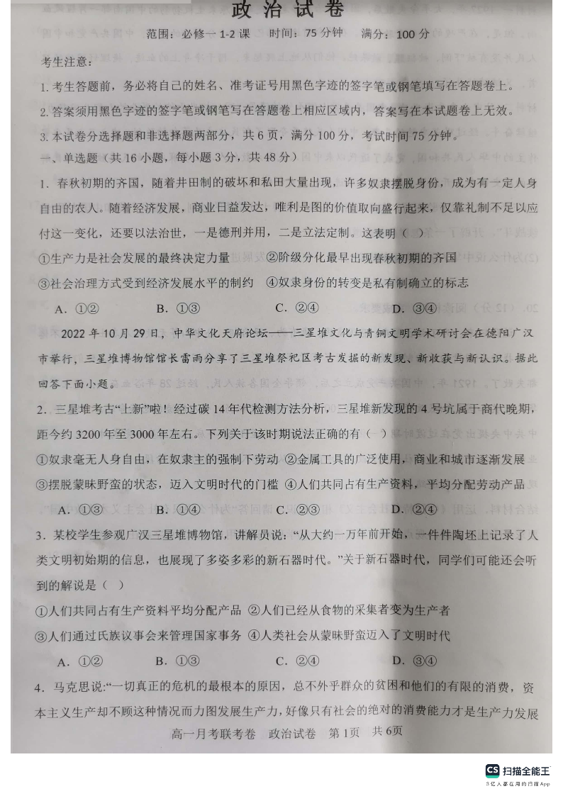 河南省河南中原名校联考2023-2024学年高一上学期9月月考政治