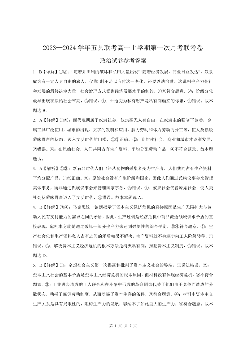 河南省河南中原名校联考2023-2024学年高一上学期9月月考政治答案