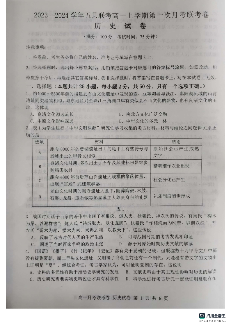 河南省河南中原名校联考2023-2024学年高一上学期9月月考历史