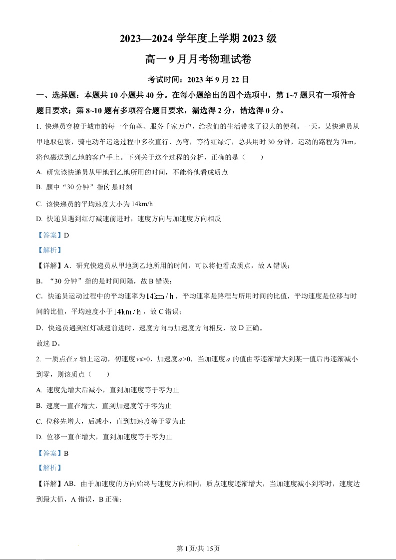 湖北省荆州市沙市中学2023-2024学年高一上学期9月月考物理(精品解析版)