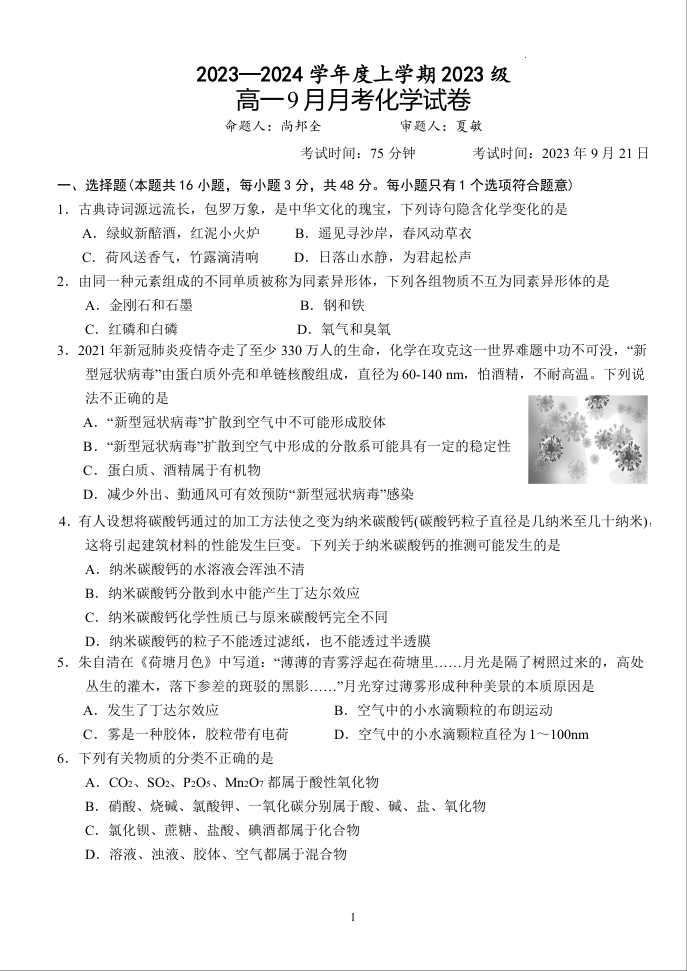 湖北省荆州市沙市中学2023-2024学年高一上学期9月月考化学+答案