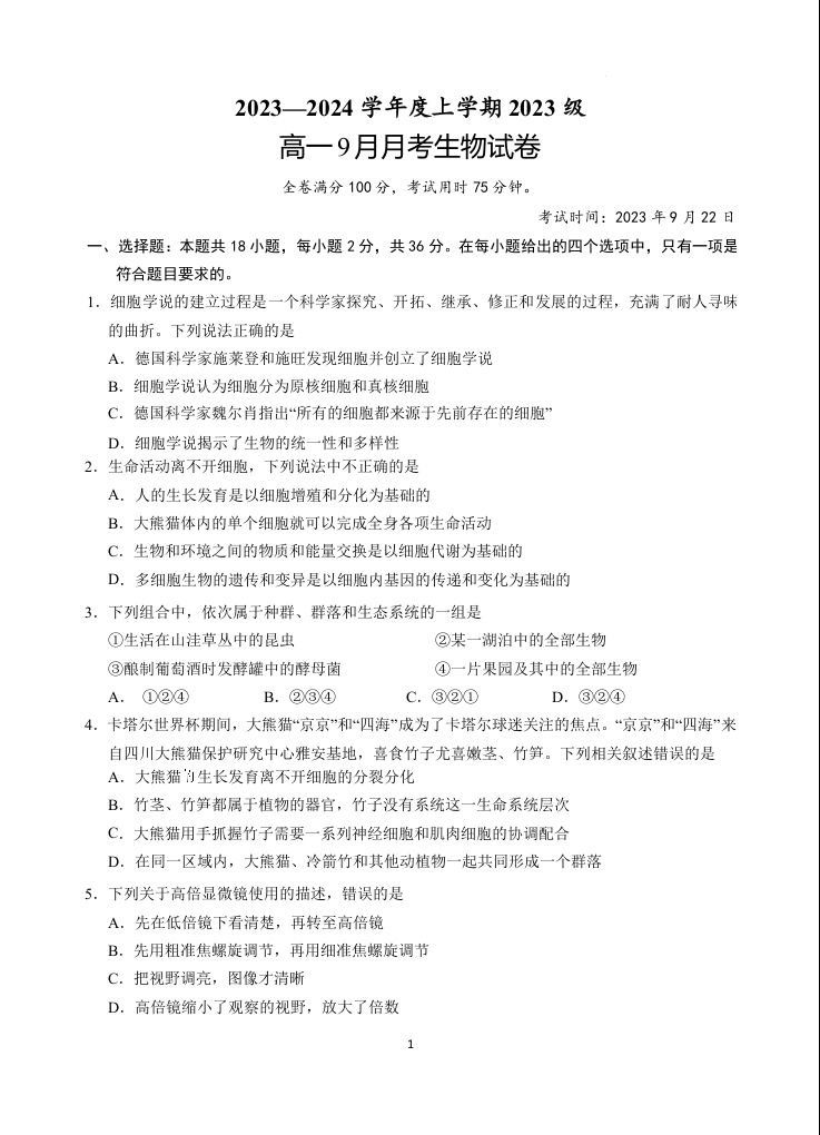 湖北省荆州市沙市中学2023-2024学年高一上学期9月月考生物+答案
