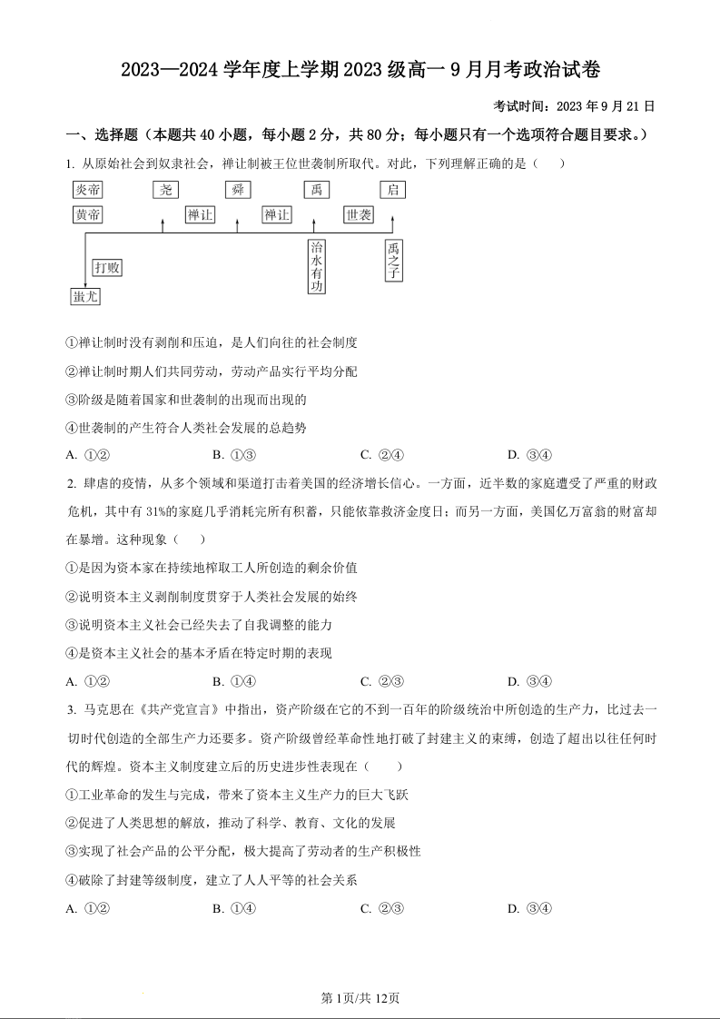 湖北省荆州市沙市中学2023-2024学年高一上学期9月月考政治(原卷版)