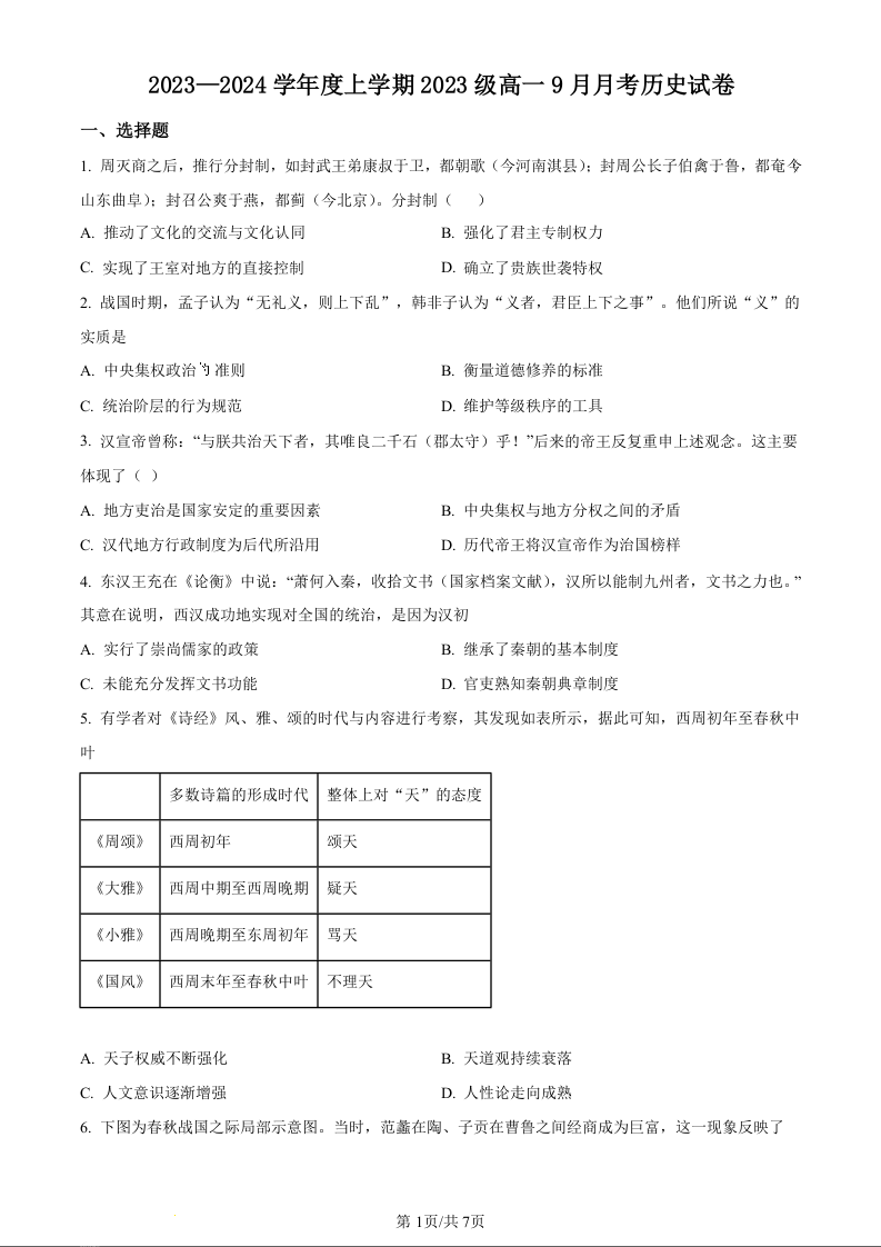 湖北省荆州市沙市中学2023-2024学年高一上学期9月月考历史(原卷版)