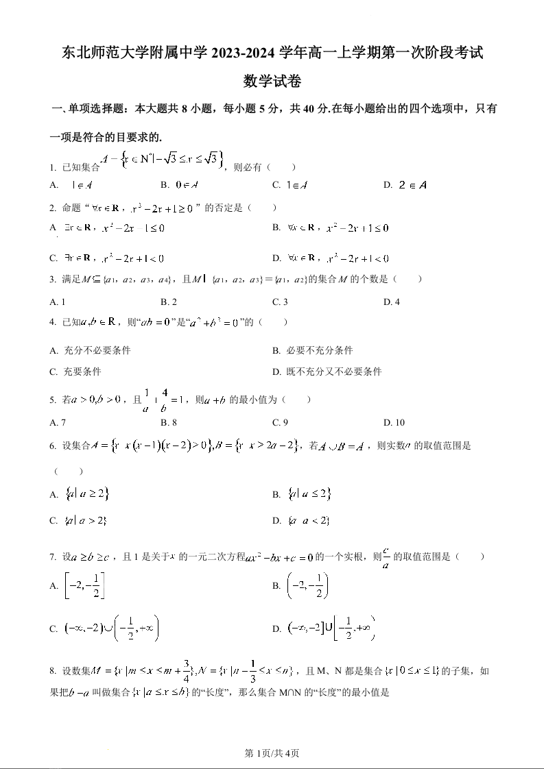 吉林省东北师范大学附属中学2023-2024学年高一上学期第一次月考数学(原卷版)