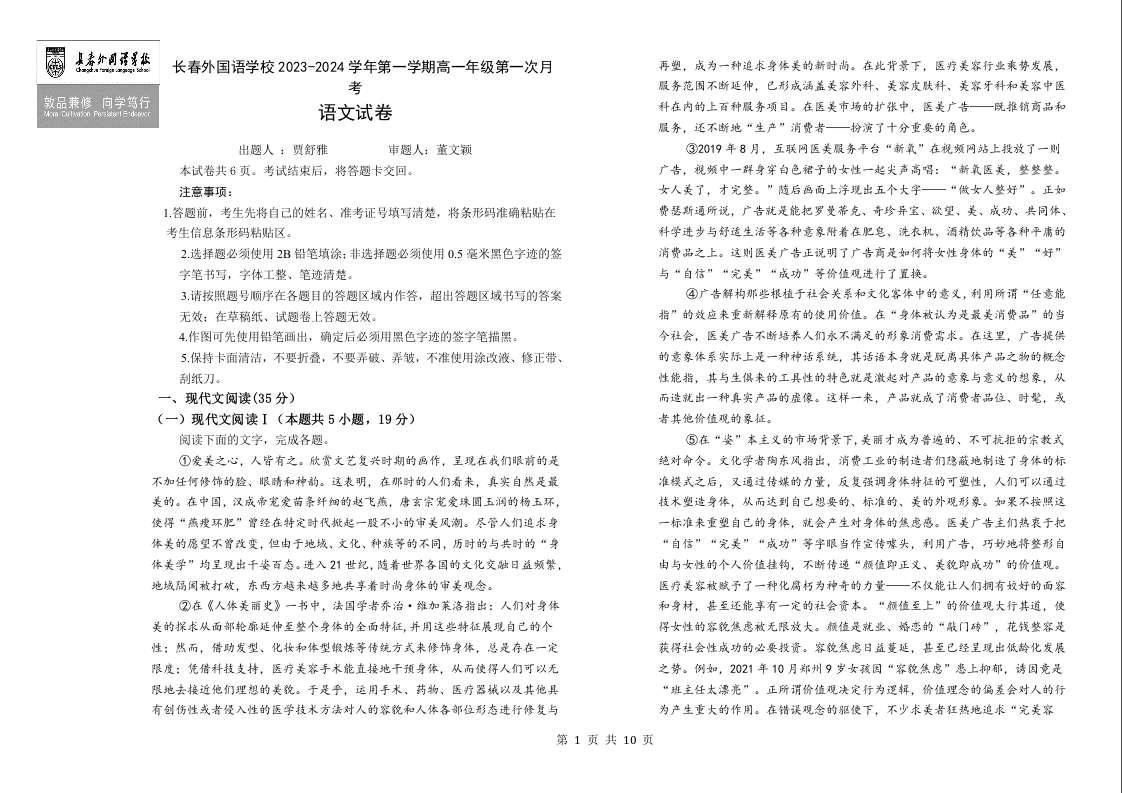 吉林省长春市朝阳区长春外国语学校2023-2024学年高一上学期9月月考语文+答案